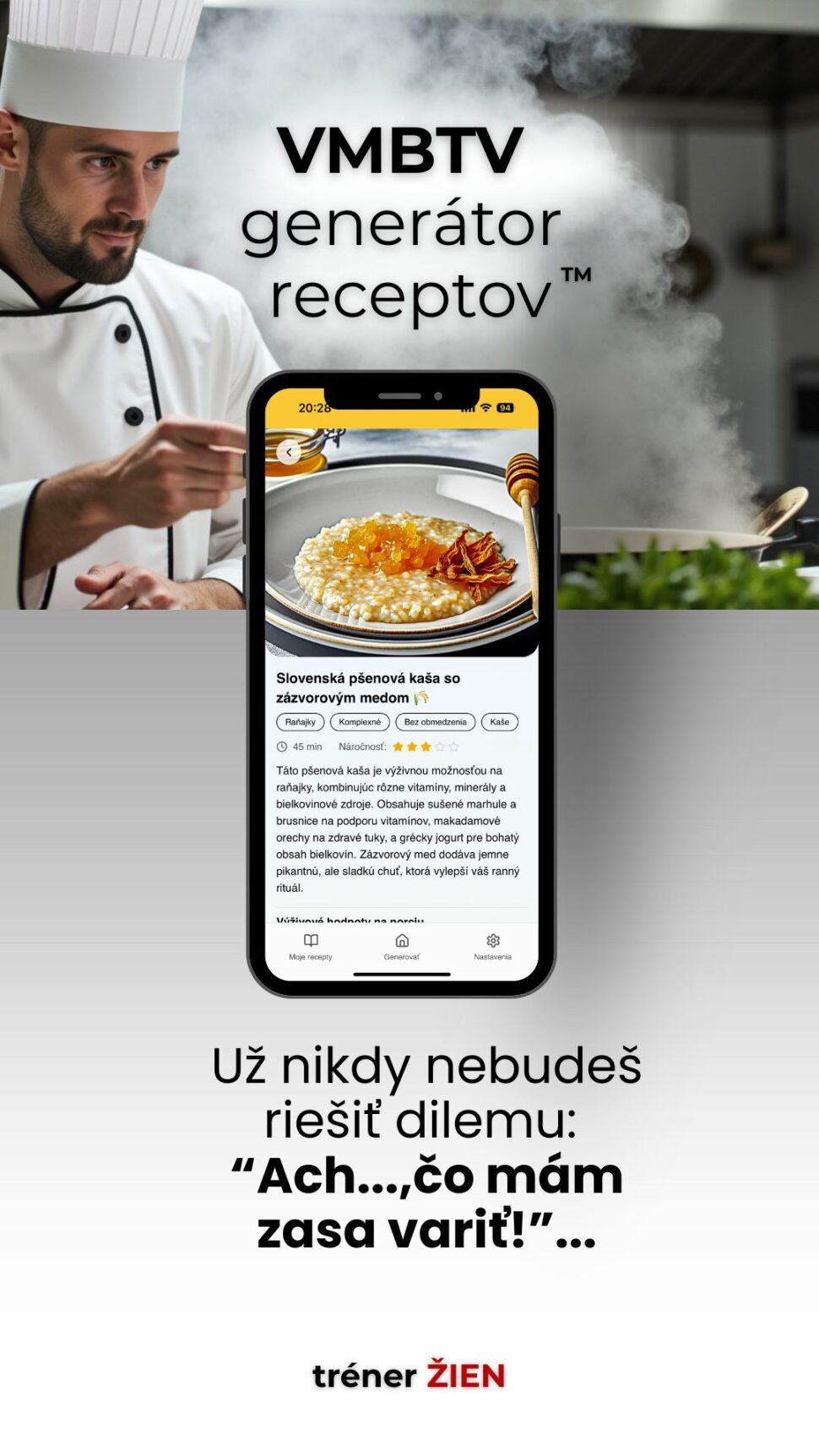 Unikátny nástroj navrhnutý trénerom ŽIEN, ktorý generuje nekonečné množstvo receptov presne podľa tvojej chuti a zároveň rešpektuje podmienky zdravého a výživného jedla.