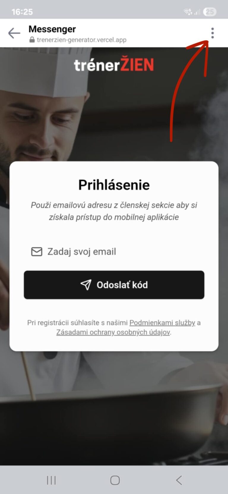 2. krok -  po kliknutí na odkaz vyššie sa ti zobrazí prihlasovacia stránka do generátora a ja v pozadí. Následne klikni na "tri bodky" vpravo hore (viď obrázok)